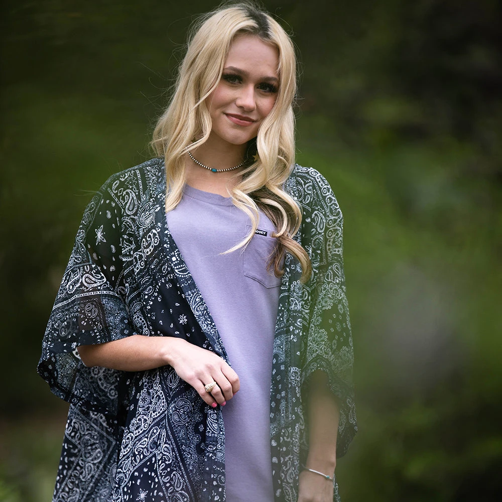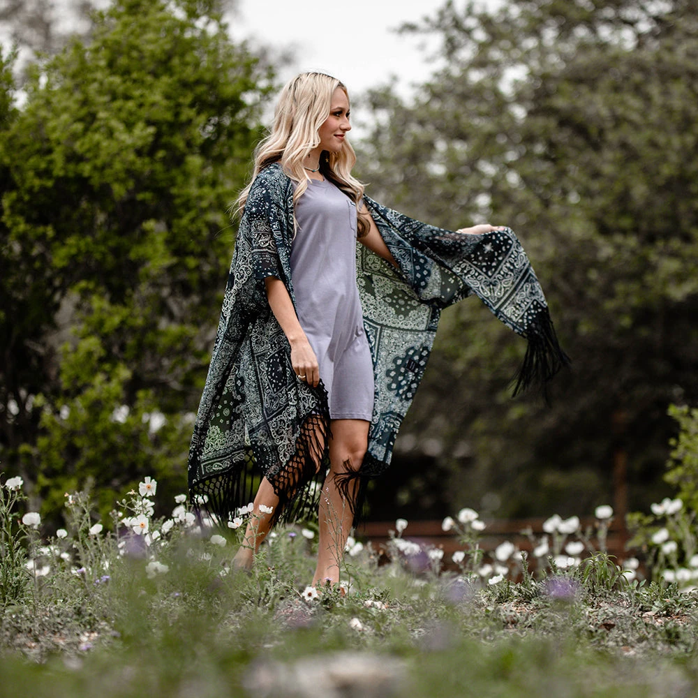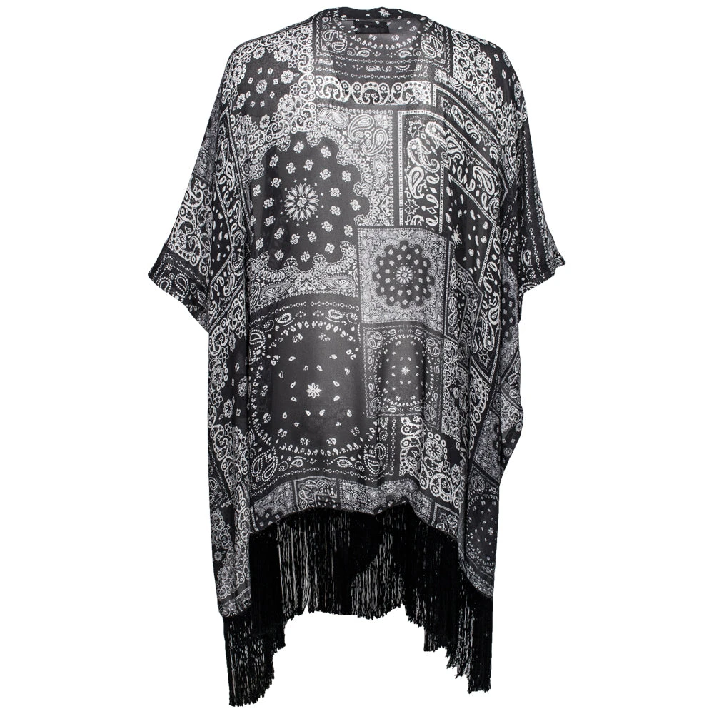 HOOey Ladies Long Kimono Black/White Bandana W/Black Fringe