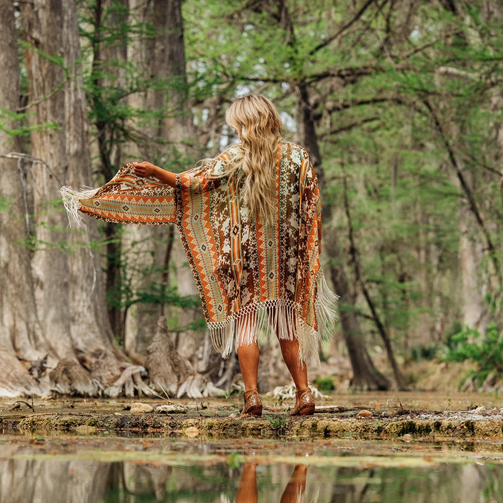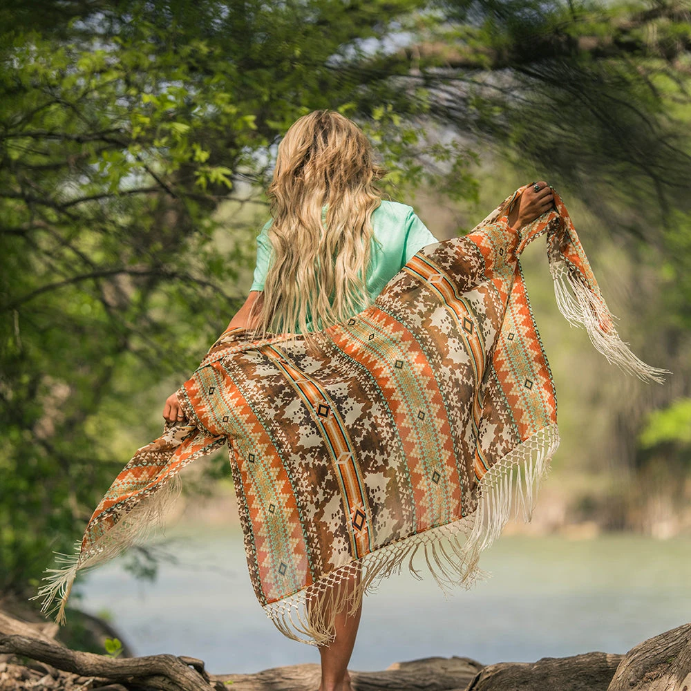 HOOey Ladies Long Kimono Tan/Cream/Orange With Cream Fringe