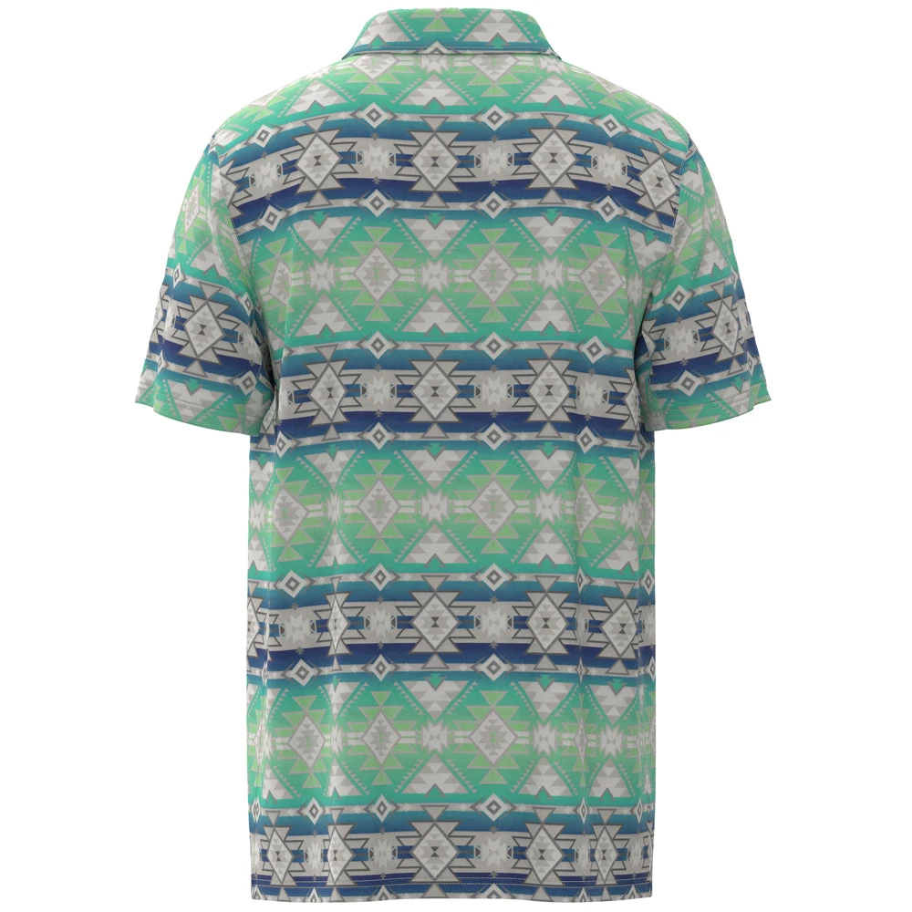 Its construction combines the underarm seam with moisture-wicking and quick-drying technologies, while also providing UPF 30 Sun Protection. Its easy wash-and-wear design, embroidered logo, and athletic fit make this Teal, Blue, and Grey Aztec pattern polo a perfect weekend option.
