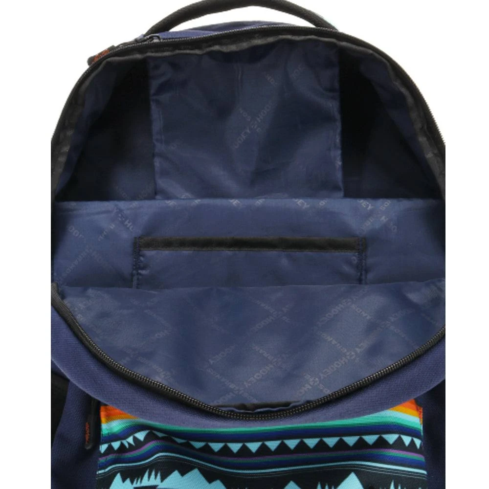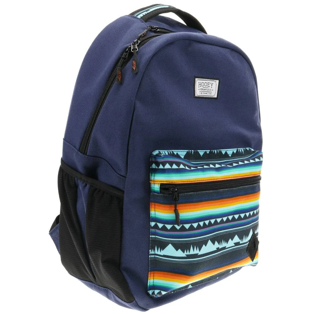 This navy/serape Hooey Backpack features a lined sunglass pocket and reinforced top handle. Comfort and convenience are optimized with padded shoulder straps and a detachable, waterproof rain cover. Padded laptop and side hydro pockets, paired with a front organization pocket, provide ample space with 25 liters of capacity in the 18″ x 13″ x 6.5″ design.